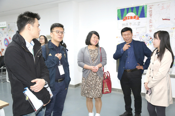 图为武汉工商学院党委书记陈伟(右二)陪同专家组长吕秀文(右三)等参观货运代理实训中心