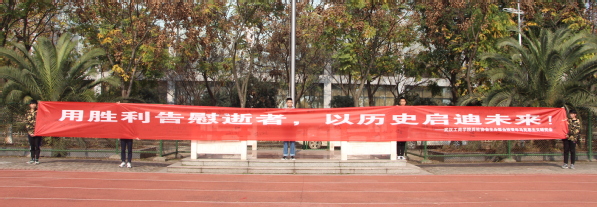 新闻中心讯(记者 叶紫瑶)12月13日是我国第五个南京大屠杀死难者国家公祭日,当天中午12:20,在武汉工商学院兵社协会与校青年马克思主义研究会的组织下,学校500余名学子在国旗台前进行了庄严的降半旗默哀仪式,各学院分团委学生会、社团组织代表们纷纷在横幅“用胜利告慰逝者,以历史及启迪未来”上签字留名,共同怀缅历史,祀我国殇。