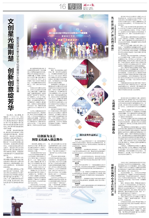 巴山楚水,白云黄鹤,钟鸣盛世……12月14日,第五届湖北省大学生文化创意设计大赛将在湖北省广播电视台800平方米演播厅举行获奖作品颁奖暨成果转化签约仪式,历时半年的创意盛宴完美落下帷幕。