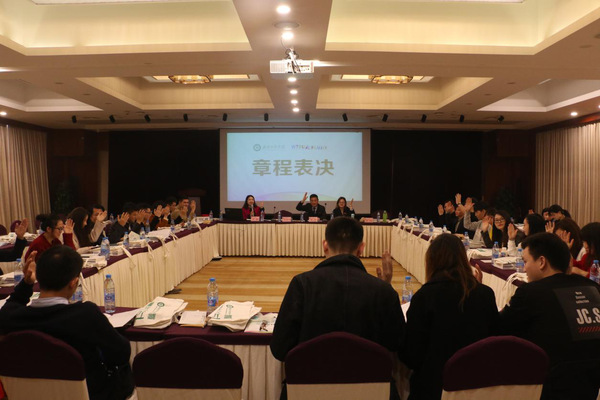 图为《武汉工商学院浙江校友会章程》表决现场 摄影:管俊