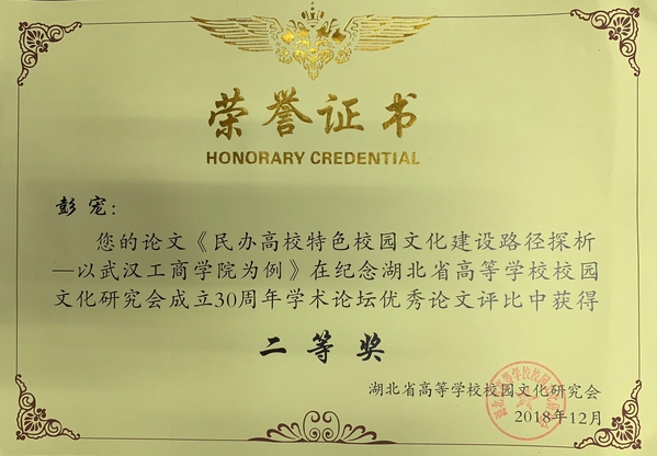 新闻中心讯(特约记者 北辰)12月25日,湖北省高等学校校园文化研究会2018年年会暨纪念湖北省高等学校校园文化研究会成立30周年学术论坛在华中师范大学的科学会堂报告厅召开。全省70余所高校领导和相关职能部门负责人齐聚桂子山,湖北省委高校工委副书记孔祥恩等领导出席会议。会上公布并颁发了“纪念湖北省高等学校校园文化研究会成立30周年学术论坛优秀论文奖”等奖项。武汉工商学院提交的论文《民办高校特色校园文化建设路径探析——以武汉工商学院为例》获纪念湖北省高等学校校园文化研究会成立30周年学术论坛优秀论文奖二等奖。