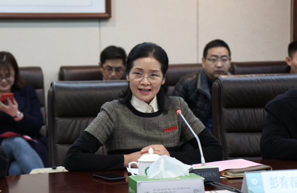 彭秀春董事长致欢迎词,她代表武汉工商学院对马来西亚宽柔中学代表团的到访表示热烈的欢迎和诚挚的问候,并介绍了学校的历史沿革和发展近况。