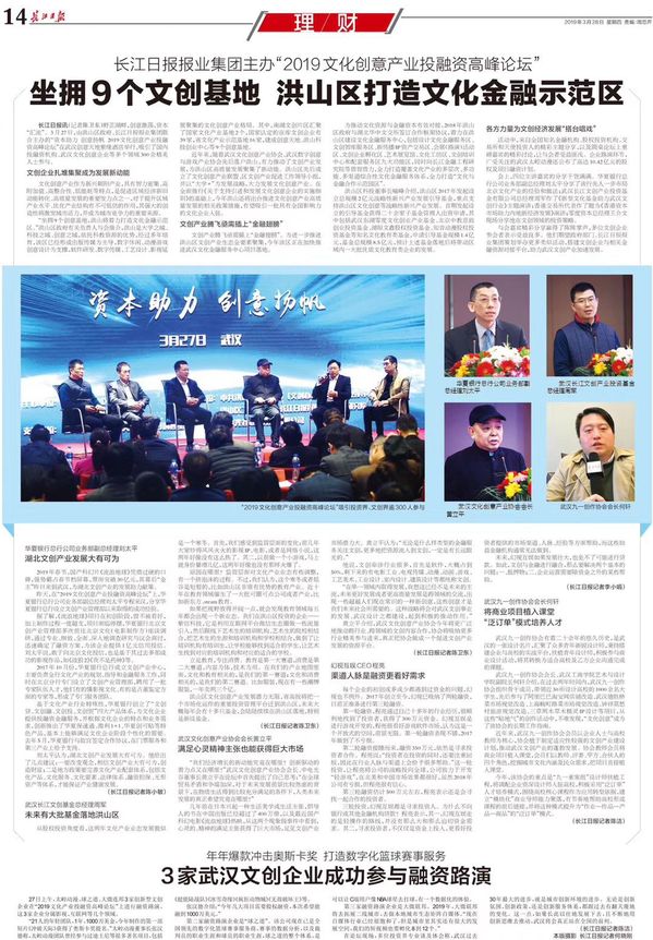 长江日报讯(记者 陈卫东)野芷湖畔,创意激荡,资本“汇流”。3月27日,由洪山区政府、长江日报报业集团联合主办的“资本助力 创意扬帆 2019文化创意产业投融资高峰论坛”在武汉创意天地紫缘酒店举行,吸引了国内投融资机构、武汉文化创意企业等多个领域300余精英人士参与。