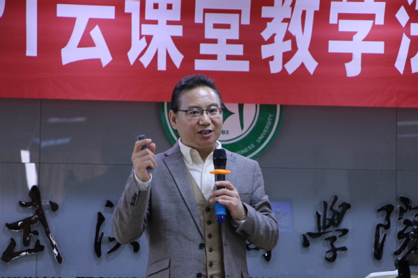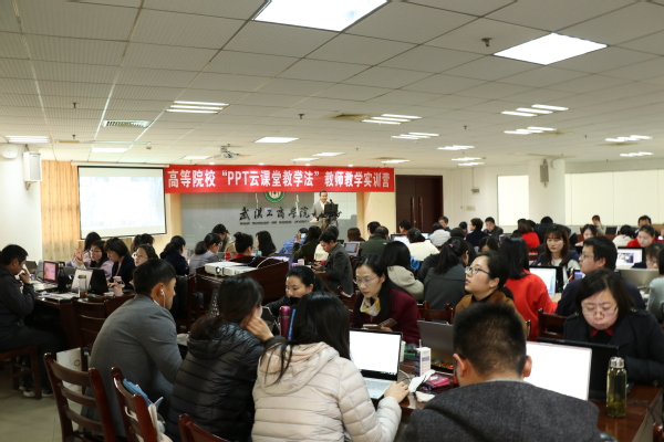 新闻中心讯(记者 许少云 张海霞 杨连骄 陈彦芳)3月23——24日,为期2天的高等学校“PPT云课堂教学法”教师教学实训营在武汉工商学院综合楼第三会议室开课,北京大学教育学院教育技术博士生导师、微课技术实验室主任赵国栋教授受邀前来主讲“自助式快课录制”云课堂授课方法,来自湖南大学、武汉理工大学、湖北中医药大学、武昌工学院、武汉晴川学院、武汉华夏理工学院、武汉工商学院7所高校78名老师参加了此次实训。