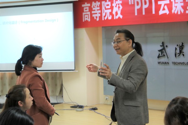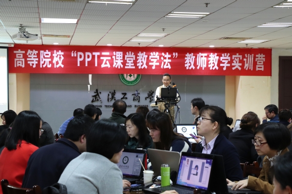 新闻中心讯(记者 许少云 张海霞 杨连骄 陈彦芳)3月23——24日,为期2天的高等学校“PPT云课堂教学法”教师教学实训营在武汉工商学院综合楼第三会议室开课,北京大学教育学院教育技术博士生导师、微课技术实验室主任赵国栋教授受邀前来主讲“自助式快课录制”云课堂授课方法,来自湖南大学、武汉理工大学、湖北中医药大学、武昌工学院、武汉晴川学院、武汉华夏理工学院、武汉工商学院7所高校78名老师参加了此次实训。