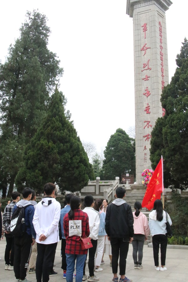 随后师生一行来到鄂豫皖苏区首府革命烈士陵园。在革命烈士纪念碑前,思政课部教研室主任张桂芳老师为同学们介绍了革命烈士们在那段国破家亡的艰难岁月里,赶赴前线为祖国为人民献出自己的满腔赤诚甚至热血生命。介绍结束后,大家共同唱起了国歌。“起来!起来!起来!不愿做奴隶的人们……”,激昂雄壮的国歌使大家激情澎湃,爱国情感油然而生。