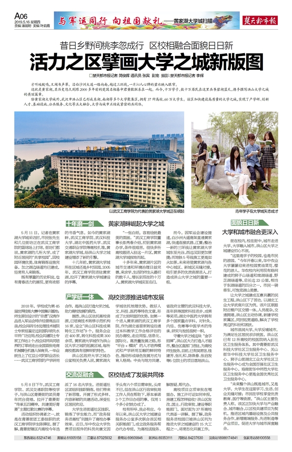 除黄家湖大学城外,武汉市洪山区已形成东湖、南湖等多个大学聚集区,拥有37所高校、60万大学生。该区加快建设高质量的大学之城,实现了产学研、创新人才、基础设施、公共服务、文化等五大融合,大学与城市正结成紧密的共同体。