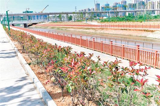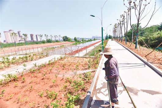 11日下午,记者再次来到这里。穿过武汉工商学院校园一直向东,穿过树林,一条绿色的生态走廊就呈现在记者眼前。只见这条港渠宽约30米,港渠两边,人行道、绿道、亲水步道依次排开,形成约50米宽的景观带。