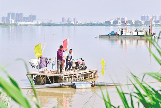 11日,记者在黄家湖岸边看到,核心区域的清淤工程正在进行。几艘清淤船拖着长长的黑色胶皮管停在湖面上。随着机械隆隆作响,黑色的泥浆源源不断被抽出。
