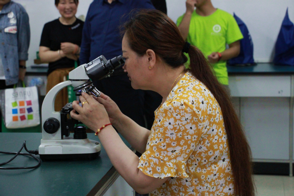图为环生学院的家长正在用显微镜观察细菌标本 摄影:柳康龙