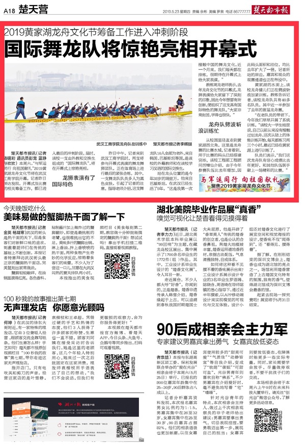 楚天都市报讯(记者潘锡珩 通讯员彭宠 蓝静 孙欢欢)本周六,“与军运同行向祖国献礼”2019黄家湖龙舟文化节将在武汉工商学院开幕。记者昨日探访发现,开幕式及比赛的相关筹备工作,都已进入最后的冲刺阶段。届时,该校一支由外教和交换生组成的“国际舞龙队”,将在开幕式上惊艳亮相。
