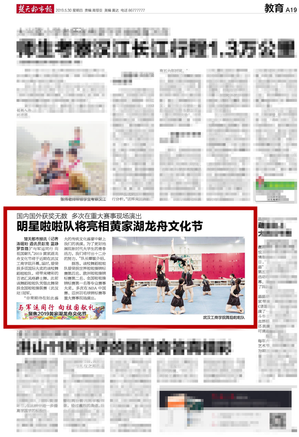 楚天都市报讯(记者潘锡珩 通讯员罗袁璐)“与军运同行向祖国献礼”2019黄家湖龙舟文化节将于近期在武汉工商学院开幕。届时,曾荣获多项国际大奖的该校舞蹈啦啦队,将带来精彩的百老汇风格爵士舞,此前该舞蹈啦啦队凭借此舞荣获全国啦啦操联赛(武汉站)冠军。“非常期待在如此盛大的传统文化盛宴中献上我们的表演,为了更好地展现新时代大学生的青春活力,我们将付出十二分的努力。”队长覃敏介绍。