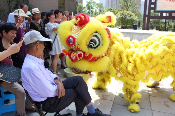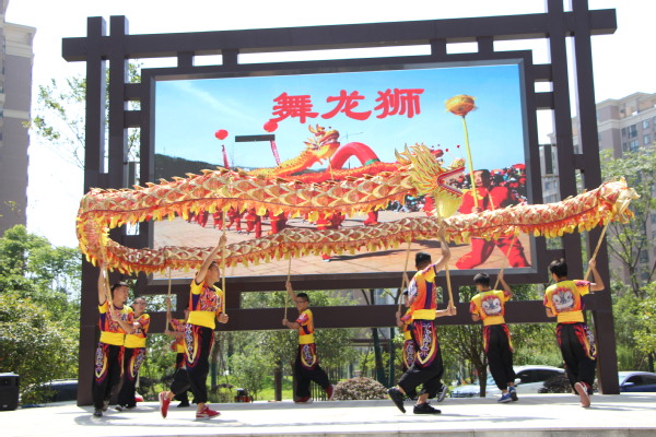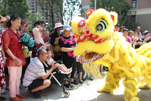 武汉工商学院龙狮队的大学生们以一场精彩的舞龙舞狮表演拉开了端午节活动的序幕,矫健的身姿、熟练的动作赢得了居民们的阵阵掌声。