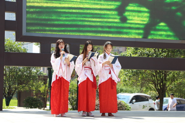 在诗歌朗诵环节,大学生们穿着古代传统服饰为居民们表演诗歌朗诵《国殇》《九歌》《九章》,以此缅怀屈原,普及端午知识,弘扬端午传统文化。