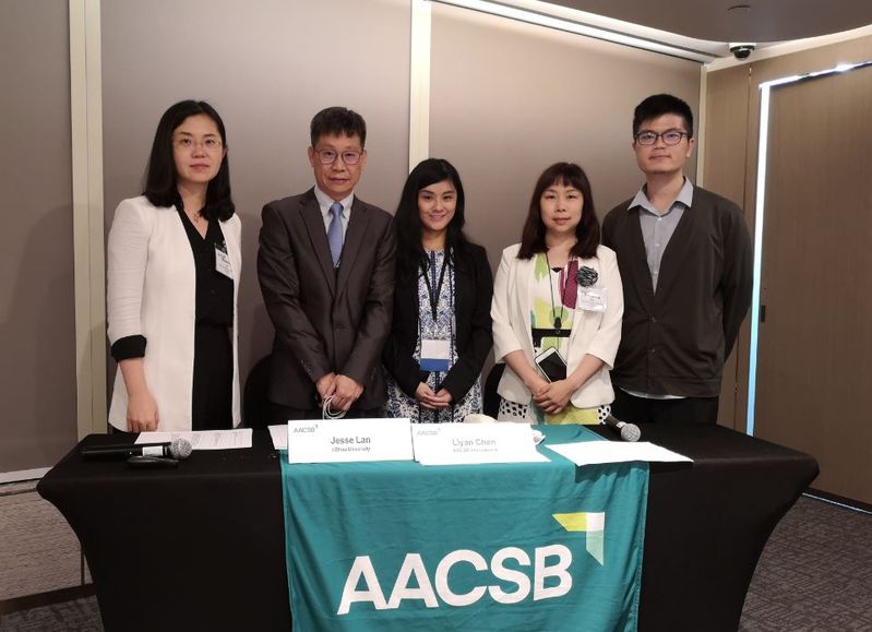 图为武汉工商学院与会代表与AACSB亚太总部协调员Chee Peng Tan(右一)、认证经理Liyan Chen(中)合影