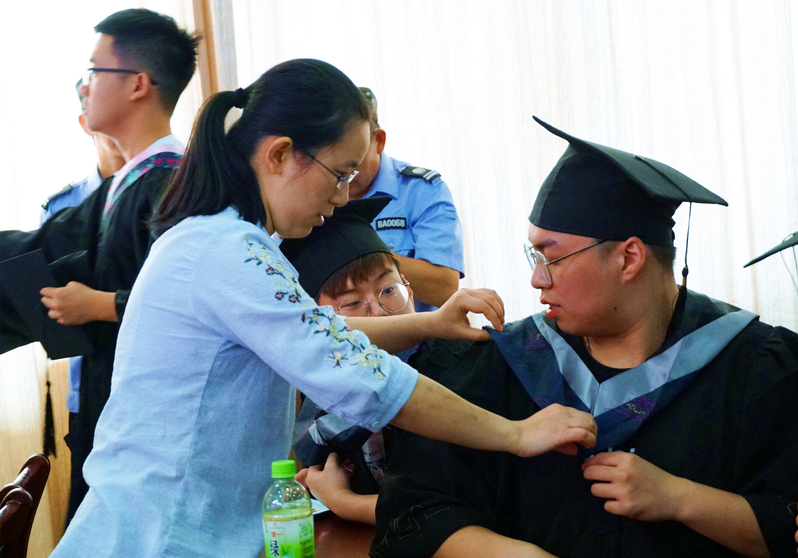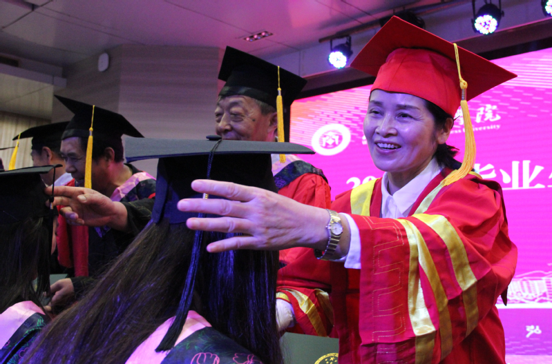 图为彭秀春为学生拨穗 摄影:冯哲昊