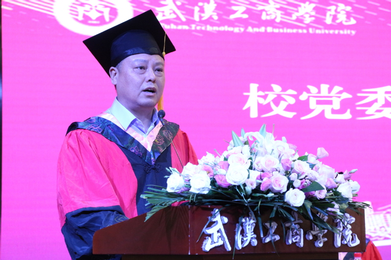刘生元书记发表了饱含深情和祝福的讲话。他说,四年前,同学们怀揣梦想与激情走进武汉工商学院,在这里,留下了辛勤的汗水、奋斗的足迹和激扬奋发的青春豪情;在这里,大家参与了学校的建设与发展,见证了学校成绩的取得,和学校共同成长和进步,也给学校留下了宝贵的记忆。