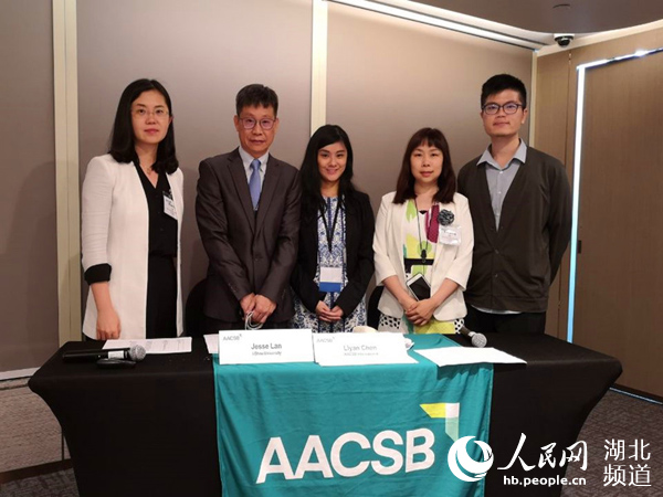 武汉工商学院与会代表与AACSB亚太总部协调员Chee Peng Tan(右一)、认证经理Liyan Chen(中)合影