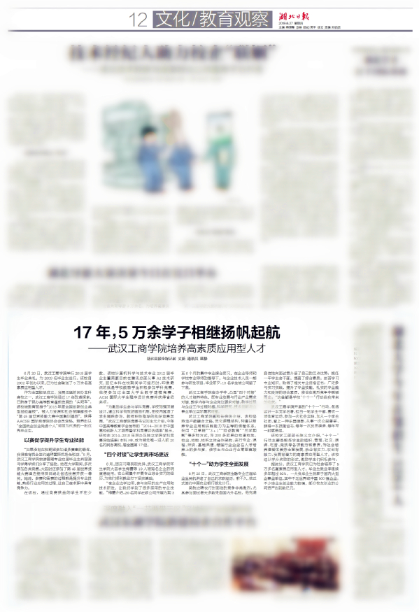 作为全国较早成立、发展迅猛的民办本科高校之一,武汉工商学院经过17年改革探索,已跻身于民办高等教育蓬勃发展的“头班车”。该校被教育部授予“2018年度全国创新创业典型经验高校”,被人力资源和社会保障部授予“第45届世界技能大赛中国集训基地”,获得AACSB国际商学院协会会员资格,培养出以“全国就业创业先进个人”邓丽为代表的一批优秀毕业生。