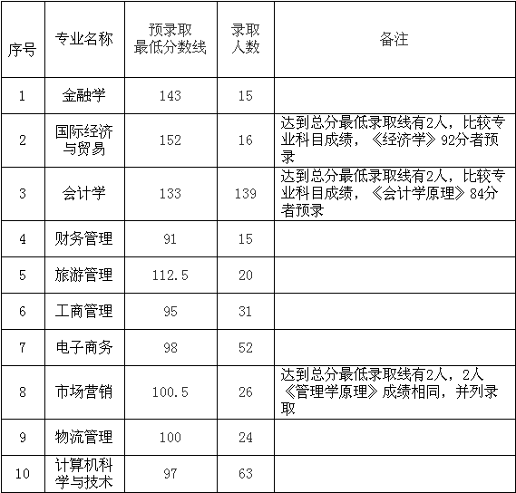国际经济与贸易专业有2人、会计学专业有2人同时达到预录取最低分数线,按照招生简章公布的录取原则,若出现总分相同时,比较专业科目成绩,专业科目分数较高者预录。市场营销专业有2人达到预录取最低分数线,专业课考试科目成绩相同,予以并列录取。