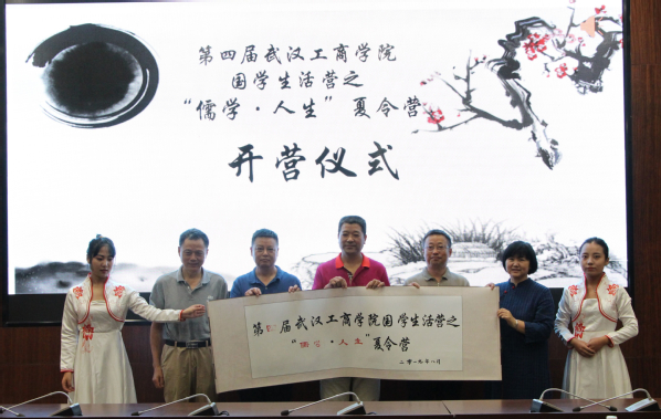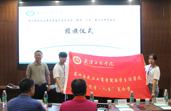 随后,左宗文校助为第四届国学生活营之“儒学·人生”夏令营营员授旗。曹建国教授、曾彦惠博士、刘生元书记、左宗文校助、吴天明院长共同在“武汉工商学院第四届国学生活营之儒学人生夏令营”书法卷轴上盖印,正式为夏令营活动开幕。