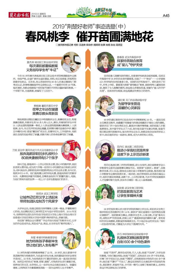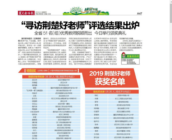 楚天都市报讯(记者 揭明玥)桃李不言,下自成蹊。老师是火种,点亮了学生的心灵;老师是石阶,助学生一步一步朝着梦想攀爬。在第35个教师节来临之际,2019“寻访荆楚好老师”大型公益活动评选结果出炉,1个教师集体获特别奖,30人(或团队)获“荆楚好老师”荣誉称号,20人获提名奖。今天晚上,2018“寻访荆楚好老师”大型公益活动颁奖典礼,将隆重举行。活动主办方将现场向30名“荆楚好老师”颁发奖杯、证书及每人一万元奖金;向特别奖和提名奖获得者颁发奖杯和证书。“寻访荆楚好老师”大型公益活动已连续举办三年,由湖北省教育厅支持,楚天都市报、湖北教育基金会、湖北电视教育频道联合主办。今年3月,活动开展以来,收到了全省各地约600份好老师推荐、自荐材料。楚天都市报记者走进各地学校深入采访,对数十名老师的先进事迹进行了报道宣传。8月份,该活动还举行了网络投票推选活动,响应热烈,11天里网站浏览量近800万人次,获点赞320万次。