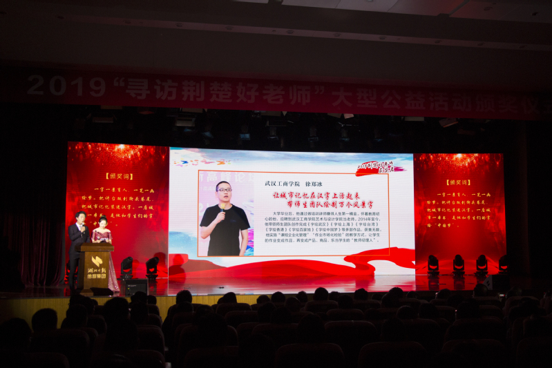 新闻中心讯(记者 许少云)9月5日晚7:00,2019“寻访荆楚好老师”大型公益活动颁奖典礼在楚天传媒大厦隆重举行。在第35个教师节来临之际,湖北省51名(组)优秀教师用自己的燃情付出收获了沉甸甸的节日礼物,武汉工商学院艺术与设计学院徐郑冰副教授从全省600多位候选人中脱颖而出,获评2019“荆楚好老师”荣誉称号。武汉工商学院党委书记刘生元应邀参加了活动。