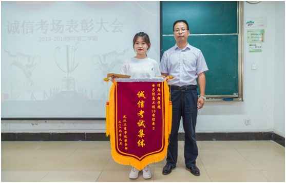经外学院副院长马洁、党总支书记胡航,信工学院常务副院长胡成松,文法学院党总支书记陈敏分别为“诚信考试集体”“诚信考试个人”颁发了荣誉称号锦旗和奖金。