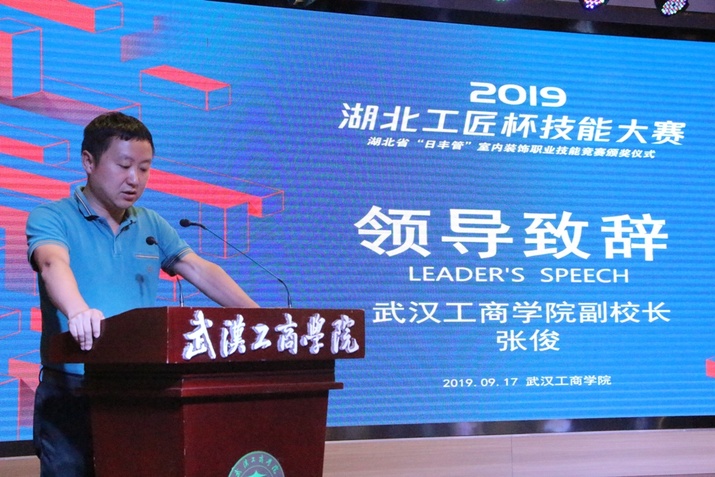 9月17日,2019 年“湖北工匠杯”技能大赛——湖北省“日丰管”室内装饰职业技能竞赛颁奖典礼在武汉工商学院举行,作为比赛的协办单位,该校副校长张俊在颁奖现场表示,举办2019年“湖北工匠杯”技能大赛,是为全省技能精英搭建一个切磋技艺、展示技能的大舞台,进一步营造劳动光荣的社会风尚和精益求精的敬业风气,引导广大青年学生钻研技术、苦练技能,走技能成才之路,为谱写中国梦提供源源不断的技能人才支撑。