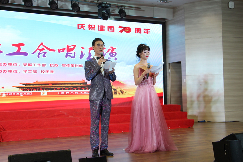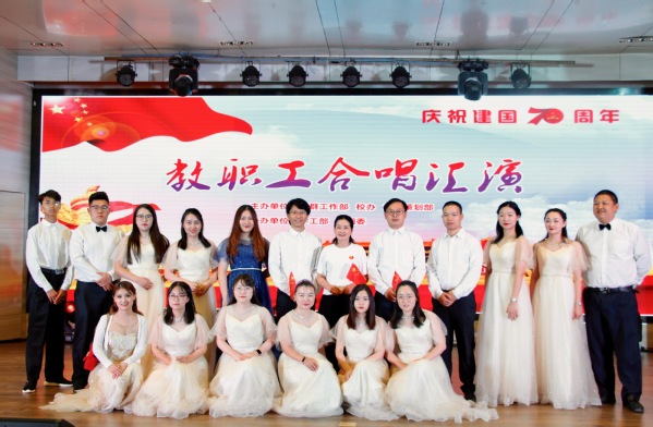 合唱汇演由公共课部朱威老师和国际教育学院张青老师主持。学校各单位13支代表队依次上台表演,满怀激情的歌颂伟大祖国、唱响时代旋律。《歌唱祖国》《我和我的祖国》《走进新时代》《东方之珠》《我的祖国》《军港之夜》《映山红》《祖国不会忘记》《走向复兴》《我的中国心》《我爱你中国》《闪闪红星》……一首首耳熟能详的爱国歌曲在舞台上唱响,串联起一部波澜壮阔的新中国史,传递着武工商人对祖国的深情挚爱和美好祝福。在校工会带来的《在水一方》舞蹈表演结束后,合唱汇演圆满落下帷幕,校领导集体上台合影留念。