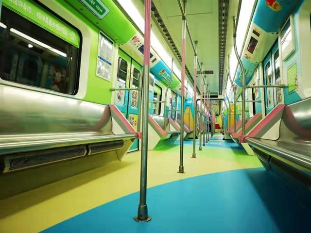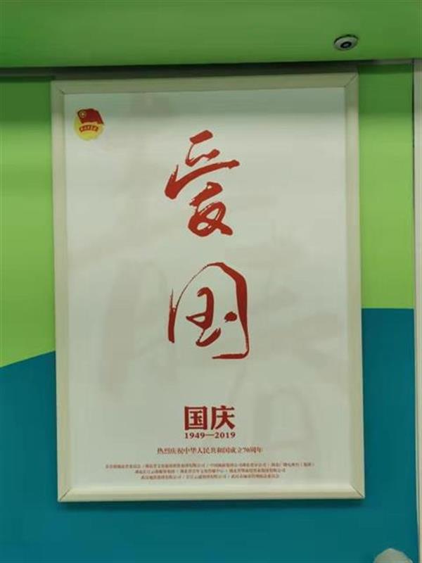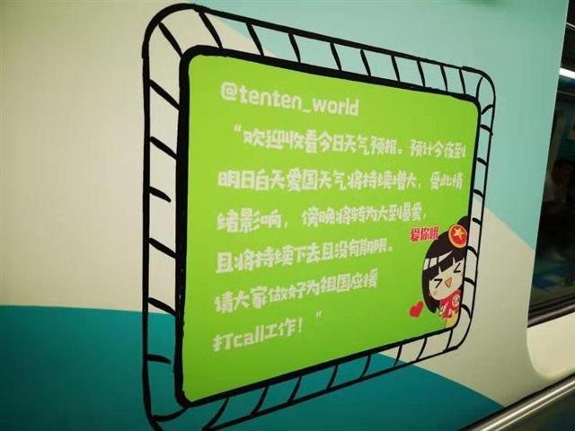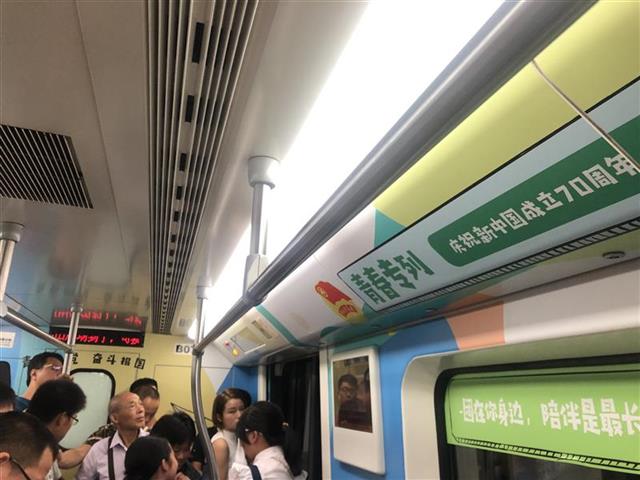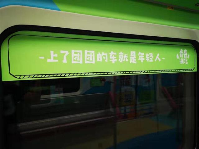 10月2日9点45分地铁宝通寺站,乘上地铁二号线,中国地质大学(武汉)研究生赵风顺感觉这趟列车有点不一样,整个车厢洋溢着青春的气息:车厢内部,蓝绿搭配的装饰色调,墙面上贴着青春的口号标语,还有“湖小青”卡通人物,展现少先队、青媒小厨、青创工程、希望工程、志愿服务等品牌形象。