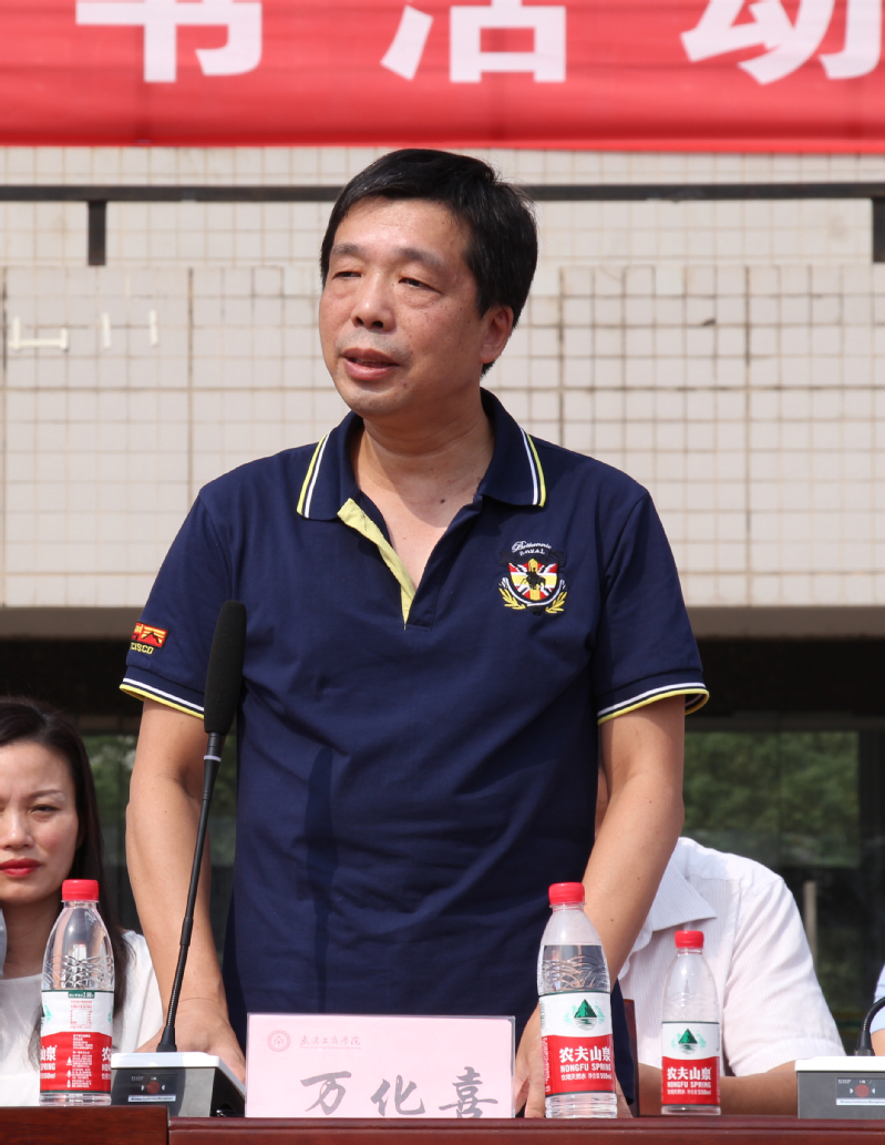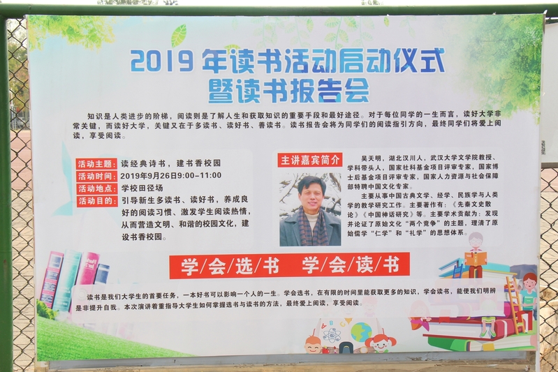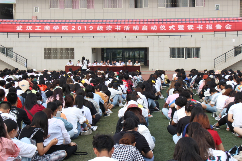 新闻中心讯(记者卢晨)为了营造“多读书,读好书”学校氛围,推进武汉工商学院精神文明建设和书香校园建设,持续开展“悦读工商,书香校园”读书活动,9月26日上午9:00,由武汉工商学院教务部、学生工作部、图书馆联合举办的2019年读书活动启动仪式暨读书报告会在学校田径场举行。武汉工商学院国学教育与研究院院长吴天明向2019级全体新生分享了自己读书的心得。