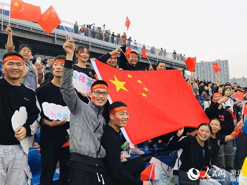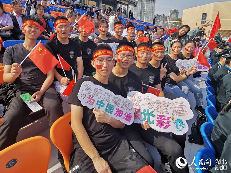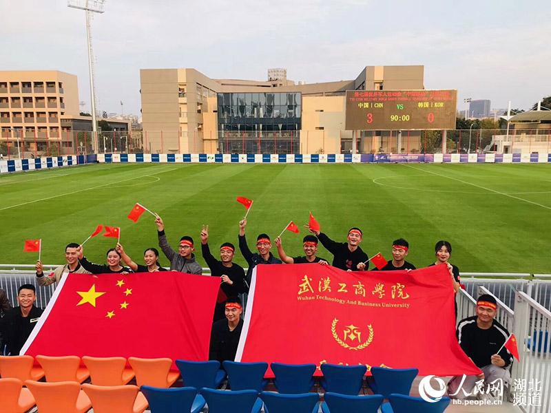 身穿印有中国国旗的统一服装,脸贴国旗贴纸,头系“中国必胜”系带,手持小国旗,并专门设计了为中国加油、为武汉喝彩的手持应援牌……10月17日下午3点,第七届世界军人运动会女子足球小组赛在武汉全民健身中心拉开帷幕,中国八一女足3:0战胜韩国队赢得开门红。武汉工商学院13名退伍大学生一身“豪华”的应援装备与行头,化身最强助威“兵”团到现场观看了比赛,为中国队应援、加油助威。