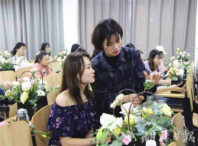 湖北日报讯(记者韩晓玲、通讯员段开鑫、李洋洋)“可选择45度角斜插。”“摆放要有层次感,具有观赏性。”10月24日下午,作为武汉工商学院“2019就业季”系列活动中的特别课程,一堂职场插花艺术分享课在该校开讲。花艺设计师熊倩受邀担任主讲人,一边示范插花,一边向学生们讲解相关技巧。