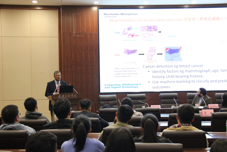 座谈会结束后,Miller院长在学校第四会议室作了主题为“人工智能新时代”的专题讲座。Miller院长通过举例指出人工智能未来发展方向与中国制造2025、工业革命4.0密切相关。同时,他还向大家介绍了英国曼彻斯特城市大学在硬件设施、就业保障、学生课外活动等方面的情况,并就4+1硕士项目向武汉工商学院学生发出了邀请。