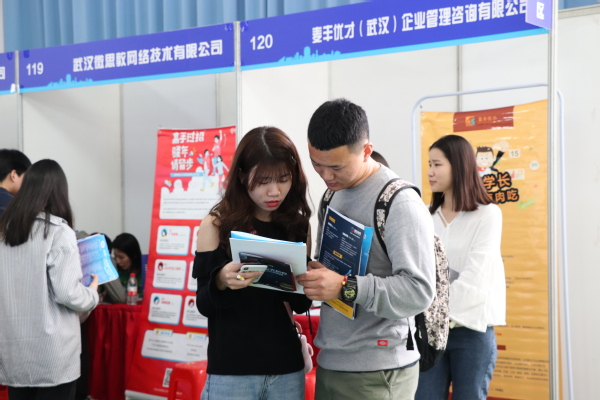 麦丰优才企业管理咨询有限公司的招聘人员曾秋是电子商务学院2019届毕业校友,她介绍到,其公司总经理也是学校2010届毕业校友,该公司目前主要招收人力资源和管理方面的人才,需要有良好的沟通能力和学习能力。武汉流利说信息技术有限公司的招聘展台也吸引了很多同学驻足,该公司招聘人员表示,除了对英语的硬要求以外,该公司更多考虑的是学生个人的工作态度、学习能力、协调能力等各种因素。