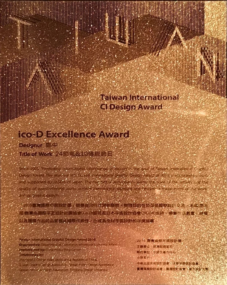 新闻中心讯(记者 袁灏宸 特约记者 丁真)近日,2019台湾国际平面设计奖TiGDA颁奖典礼在台北花漾Hana展演空间落下帷幕。武汉工商学院科技设计学院副院长郑中设计的作品《24传统节气&10传统节日》,荣获2019台湾国际平面设计奖TiGDA全场大奖和ico-D Excellence Award 卓越奖两项大奖。