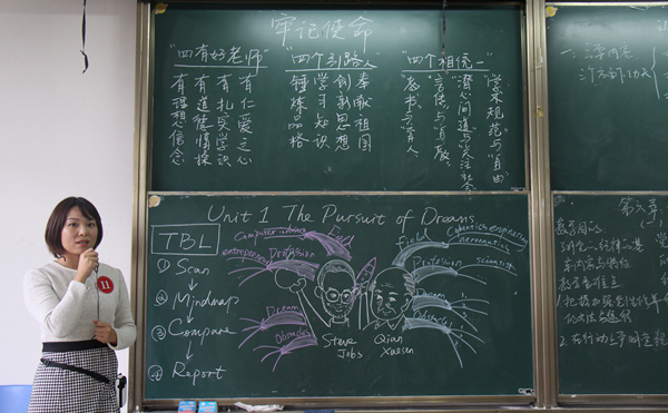 比赛过程中,老师们以一堂课的教学设计为蓝本,通过总结、浓缩和升华,合理使用简笔画、思维导图、表格、色彩等元素手段,设计出一幅幅高质量的板书。喻育芸老师以所教的《大学进阶英语》作为专业内容进行讲解,卡通图画的教学形式广受评委好评——“简单易懂,脉络清新,还能大大调动学生的积极性,让教学变得事半功倍。”李双安老师在师德师风学习心得板块,以观看习近平总书记的历史重要讲话为内容,提炼并书写了一首短诗,着重强调了“立德树人,使命担当”的思想内容;在专业课内容板书方面,从问题的引出到切线、斜率的讲解,再到小结,行书流畅,左右工整,能简能祥,受到评委一致的赞赏。