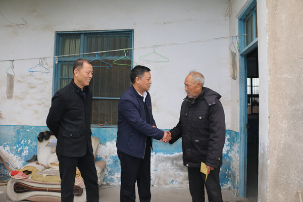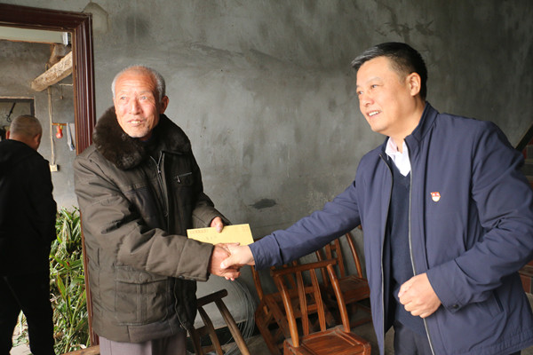随后,刘生元书记一行走访了4户贫困家庭并送上了慰问金,在贫困户肖述圣老人家家里,刘书记亲切地询问他的家庭经济情况、身体状况和致贫原因,在得知老人因养殖生猪亏损,生活陷入困境时,他紧紧握住老人家的手,鼓励道:“您要保重身体,不要灰心,相信在党和政府的关怀和帮助下,日子会越来越好的。”在刘书记的鼓励下,老人脸上露出了久违的笑容。