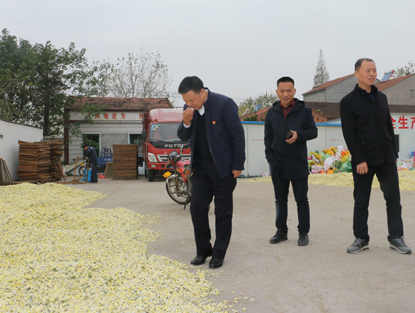 图为刘生元书记考察调研菊花加工基地 摄影:谭锦涛