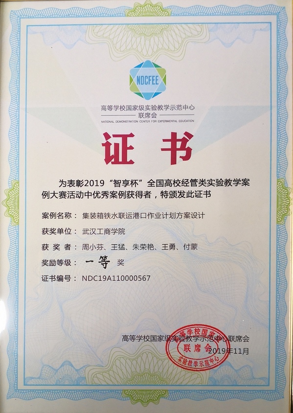 新闻中心讯(特约记者 李萱)11月22日至24日,第四届“智享杯”全国高校经管类实验教学案例大赛总决赛在广西财经学院举行。武汉工商学院物流学院周小芬副院长团队开发的实验教学案例《集装箱铁水联运港口作业计划方案设计》从来自武汉大学、上海交通大学、北京航空航天大学、对外经济贸易大学等39所高校的73个实验教学案例中脱颖而出,荣获(管理组)一等奖。