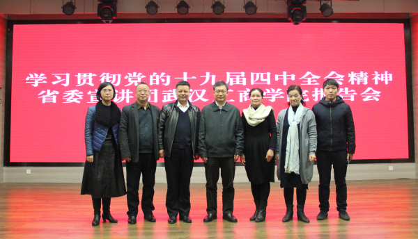 新闻中心讯(记者 万风 陈彦芳)12月11日下午14:30,根据湖北省委的安排,学习贯彻党的十九届四中全会精神省委宣讲团成员、省委宣传部副部长刘爱国同志走进武汉工商学院,为学校师生作专题宣讲报告。学校董事长彭秀春、党委书记刘生元、校长熊蕊、副校长桂裕清等校领导和广大师生党员代表一起听取了讲座。讲座由刘生元书记主持。