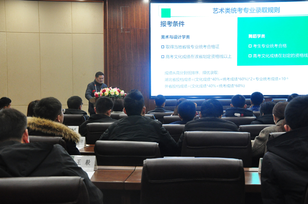 朱宜部长对武汉工商学院艺术类招生政策进行了解读,并向大家展示了2017至2019年学院各专业的录取情况。“武汉工商学院招生遵循‘公平竞争、公正选拔、公开程序、全面考核、综合评价、择优录取’的原则,艺术类统考专业的录取规则为美术与设计类专业考生在取得当地省级专业统考合格证后,高考文化成绩在该省划定资格线以上者均可填报武汉工商学院,再从高分到低分择优录取;舞蹈表演专业考生专业统考合格且高考文化成绩在划定的资格线上,按专业统考成绩从高分到低分排序录取。”