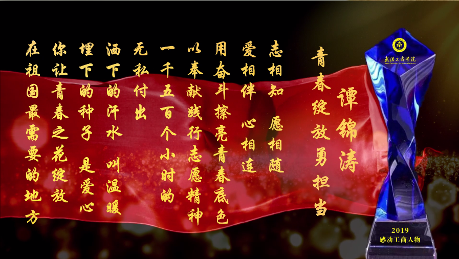 谭锦涛同学是专业综合排名第一的工商学霸,也是1500多个小时奉献青春的最美志愿者,在现场接受主持人采访时,他表示作为当代青年,要让青春之花绽放在祖国最需要的地方。