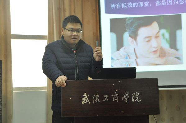 管理学院吴祺老师作为教案设计竞赛的获奖教师代表做了题为《教学活动中的媒体思维》的发言。他认为,教师目标与传媒的功能具有一致性,教学活动本身就是一种传媒活动,他将教学活动概括为一个中心、两个基本点,一个中心就是以满足学生需求为中心,两个基本点就是坚持从生活和媒体中挖掘教学素材、坚持向主持人和记者学习表达能力。围绕这些,吴祺老师列举了高效课堂与低效课堂的区别,并用个人教学中的案例给出了让课堂高效的方法。