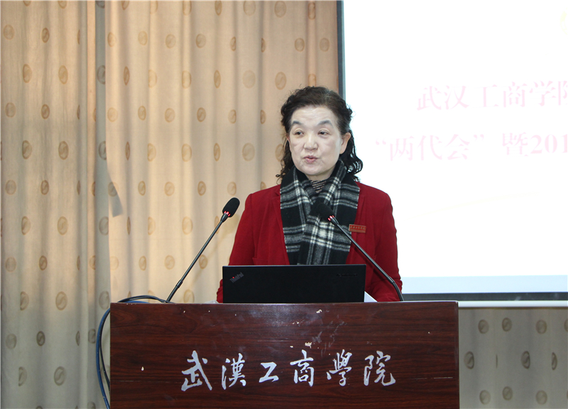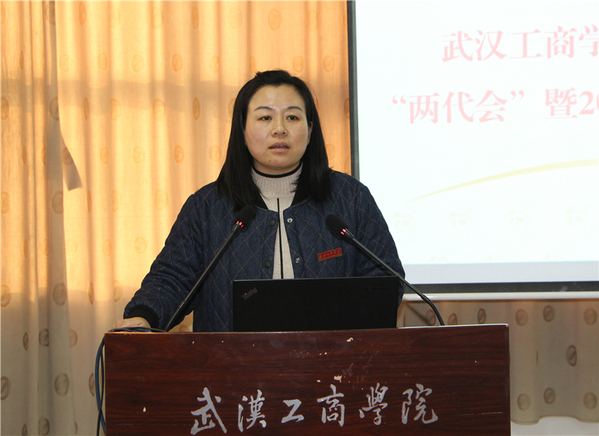 熊蕊校长代表学校向大会做了主题为《解放思想 锐意改革 攻坚克难 奋力书写高水平应用型大学建设新篇章》的工作报告。“2019年,是一个特殊的年份,在举国庆祝新中国成立70周年、爱国主义和民族自豪感迸发时,武汉工商学院也跟随时代前行的步伐,带着坚韧与执着,走过学校落实‘十三五’发展规划的冲刺之年、实施‘双一流’建设的开局之年,和启动‘三全育人’建设的关键之年。”她从学校标志性办学成效、党的建设、教育教学、学科专业、师资队伍、学生培养、管理服务、办学保障体系、民生实事等九个方面总结回顾了学校2019年的工作。