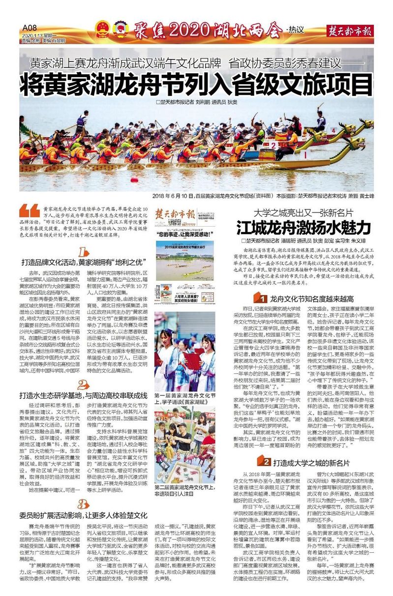 她在提案中建议,可进一步打造黄家湖龙舟文化节为代表的文化平台,将其列入省级特色文旅项目,加强活动宣传推广力度。