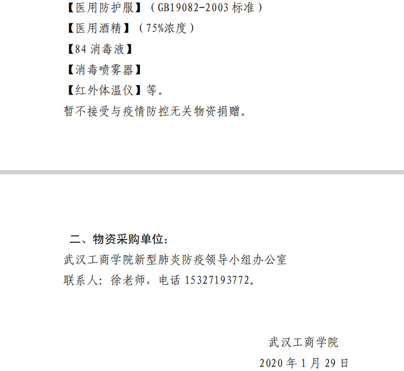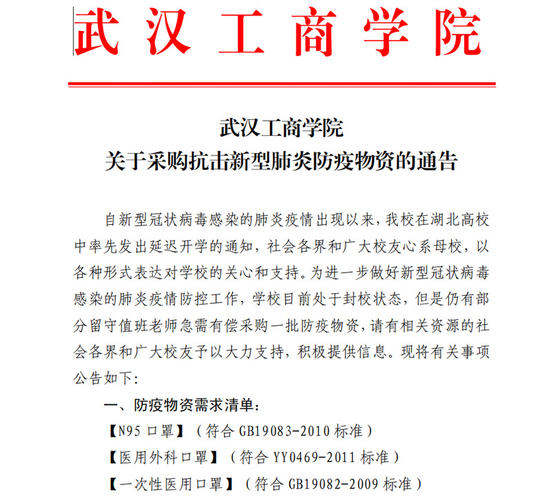 武汉工商学院关于采购抗击新型肺炎防疫物资的通告