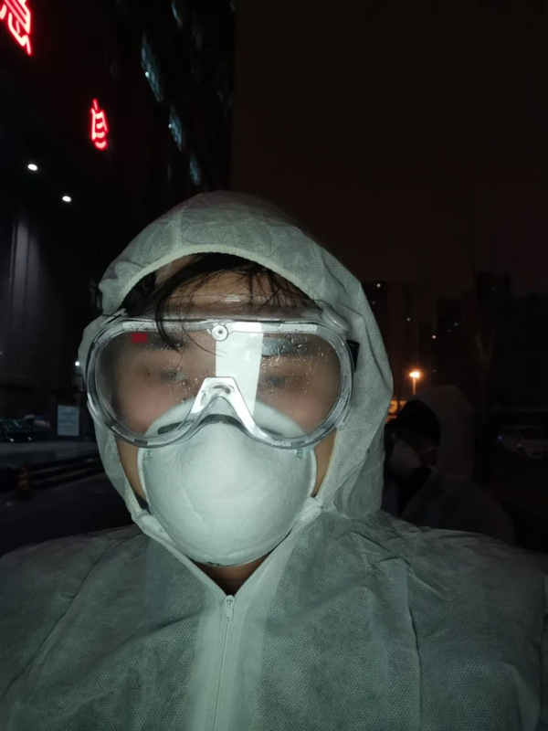 ▲图为深夜穿着防护服采访、护目镜下都是汗水的魏凡