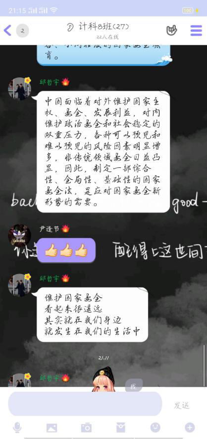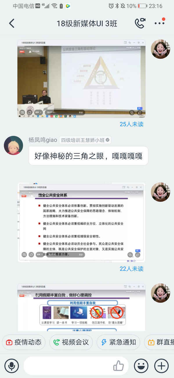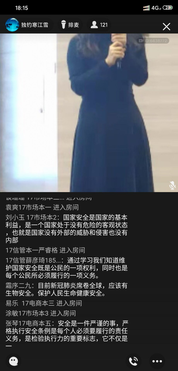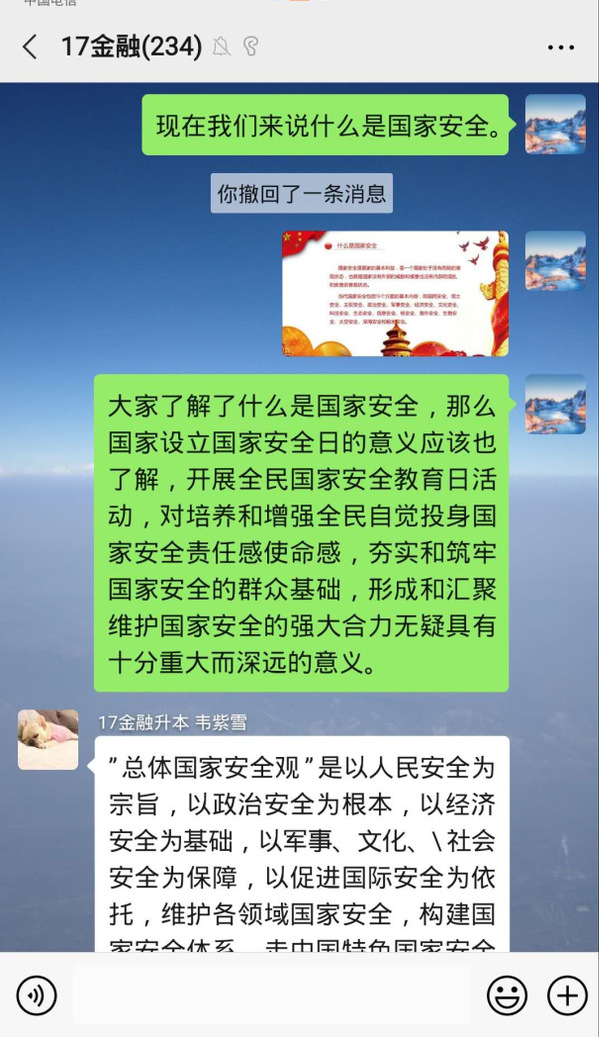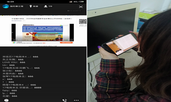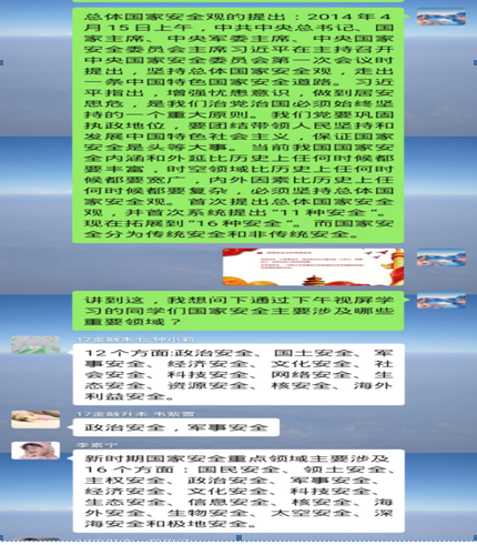 “重要通知:针对2020年第5个“全民国家安全教育日”主题教育活动,今天晚上6点我会群课堂视频直播,要求每位同学观看,届时直播间会同频学习视频,视频时长40分钟,大家进直播间互动,发表自己文字意见,积极发表哈!”这是电商学院老师在年级群中发的通知。4月15日舒娟老师利用QQ群课堂开启直播“云”班会,在直播班会中同频播放公共安全领域专家,中国工程院院士范维澄院士主讲的“总体国家安全视角下的疫情防控”2017级同学在直播间认真观看并积极互动。“国家安全的定义是什么?面对疫情,大学生应该做什么……”范维澄院士在《总体国家安全观视角下的疫情防控》向同学们讲解,“国家安全,人人有责。身为一名新时代的青年大学生,我们要正确认识国家安全形势,增强‘安而不忘危‘的忧患意识,时刻紧绷安全之弦。”同学们表示听完了这堂安全课后,对自觉培养国家安全和个人安全密切相关的认识再上一个台阶。